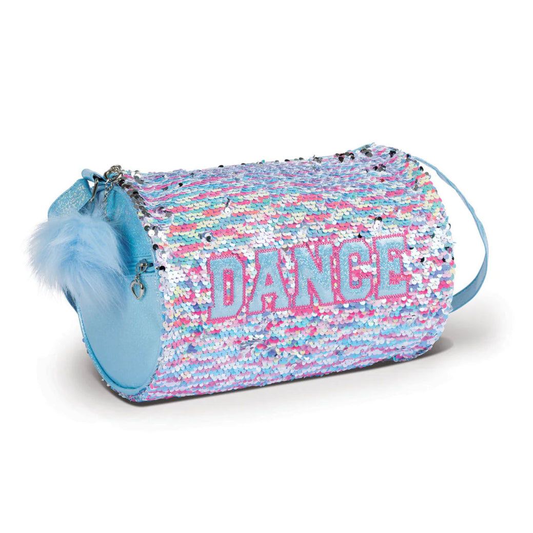 The cotton candy style B24504 from Danshuz is a bliss roll bag! A super cute sequin kids roll bag with fun glitter letters spelling DANCE adorning the front. Includes a zipper close top with adjustable shoulder strap and fun poof keychain attached to zipper pull. Wipes clean and folds flat.