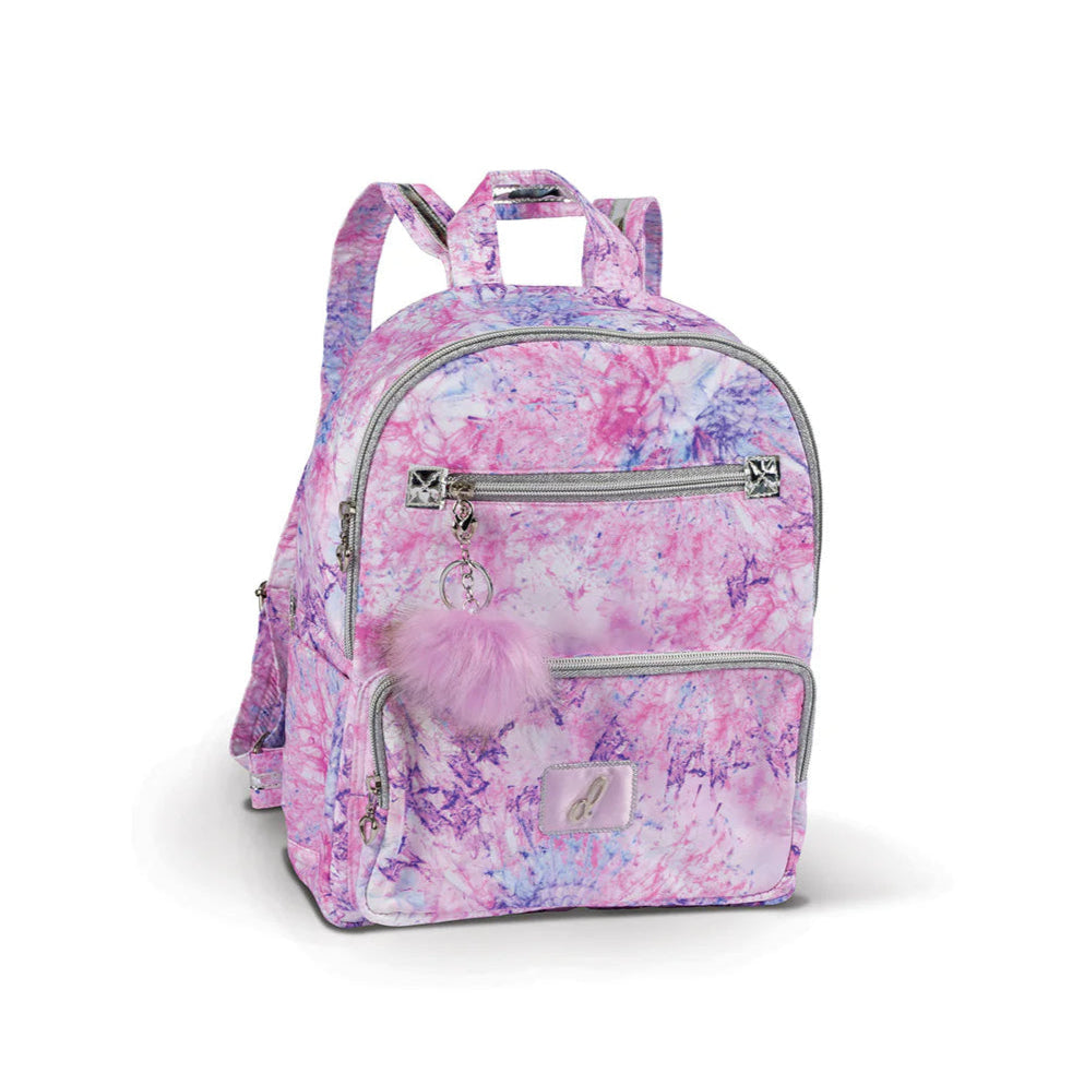 Style B24511 from Danshuz is a beautiful tie-dye print backpack features four outside pockets, two front zippers and two side. Silver piping trim plus a matching poof keychain bring this bag to life! Adjustable back straps and hanging strap complete this groovy functional bag. This bag wipes clean and folds flat.