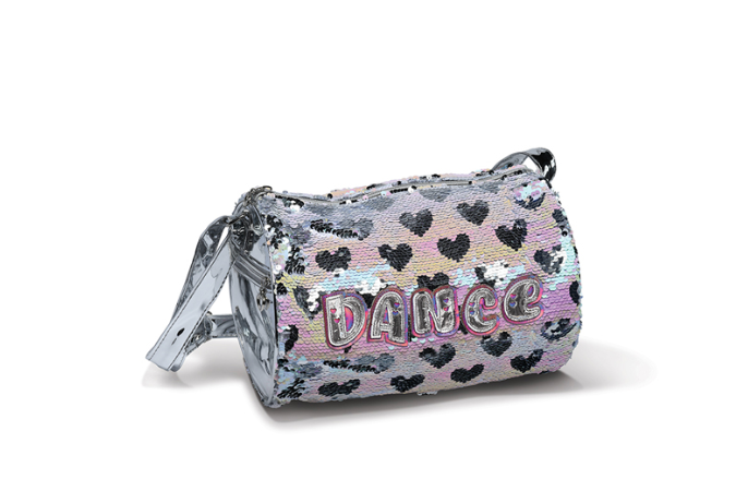 Hearts Pearlescent Duffle B23517 from Danshuz is the perfect dance bag for your little dancer. This sequin hearts dance duffel features the word Dance in silver with holographic bright pink edging. Also includes two outside pockets with heart zipper pulls and an adjustable carrying strap/shoulder strap all in a fun shiny metallic silver. This dance bag like all DANZNMOTION bags is fully lined, zips closed, wipes clean and folds flat.