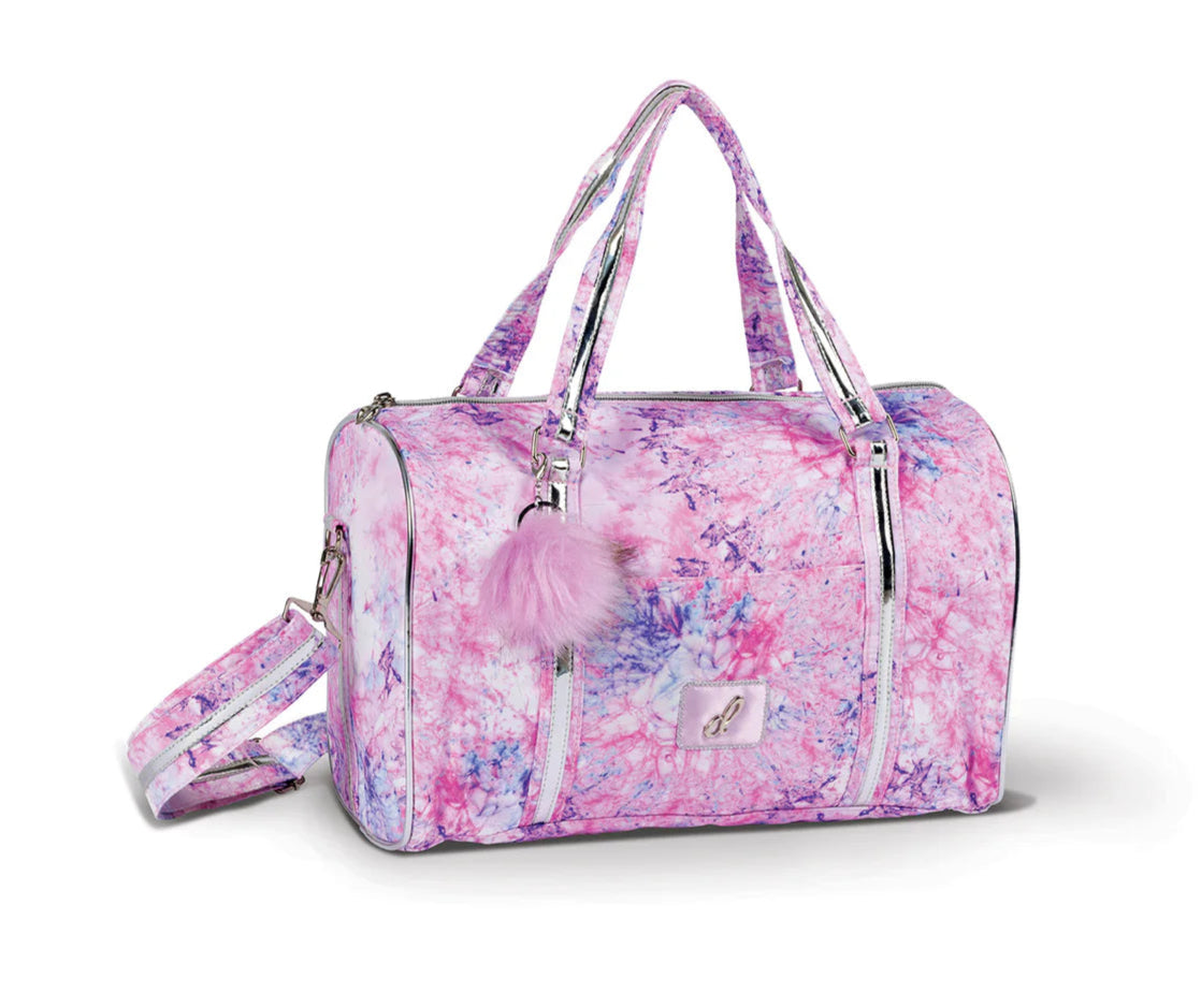 Style B24509 from Danshuz is a roomy duffle will hold all your dance needs. A cool psychedelic swirl tie-dye design covers a soft and durable nylon exterior fabrication. Features include a front exterior pocket plus full length inside zipper pocket in addition to double handles and adjustable shoulder straps. Includes matching pom-pom keychain. This bag wipes clean and folds flat.