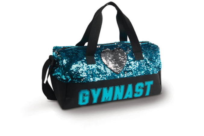 Sequin Gymnast Heart B845 from Danshuz is the perfect dance bag for any gymnast! This bag features a fun color changing sequin (turquoise to silver) duffel with a sequin heart and the word "GYMNAST" in metallic lettering. Large inner compartment holds all your gear. Made with durable nylon material. Includes double handles and adjustable shoulder strap. Lightweight and folds flat.