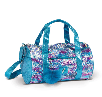 Style B24503 from Danshuz is a Turquoise and Fuchsia sparkly sequin dance duffle features a zip closure top and two side pockets plus a front zip pocket. This roomy bag will hold all your dance gear and has a double handle with an adjustable shoulder strap. Also includes a poof keychain and the Danznmotion logo front and centre. Wipes clean and folds flat.