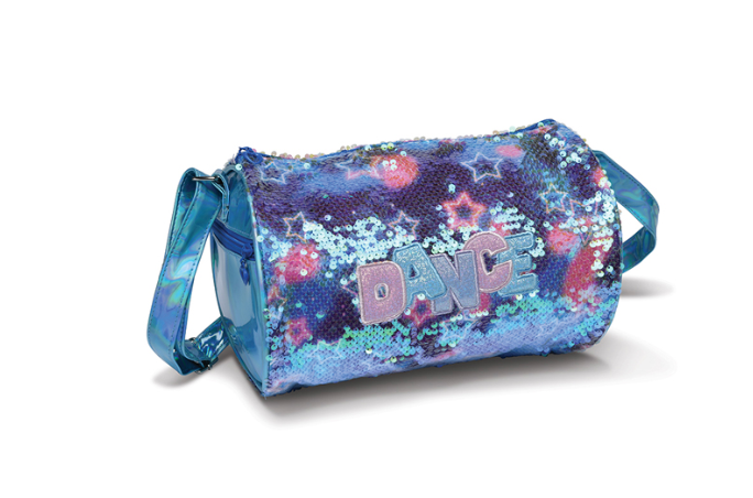 Stars Sequin Roll Bag B23514 from Danshuz will be on every kid’s wish list. This super cute sparkly sequin bag features a vibrant colorful sequin outer fabrication highlighted with stars and the word DANCE in glittery pink and blue letters. The two bag ends and adjustable carrying handle/shoulder strap are made from a holographic material, one side includes a zipper pocket. The inside compartment is fully lined, zips closed, wipes clean and folds flat.