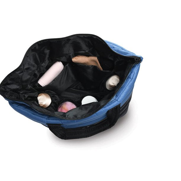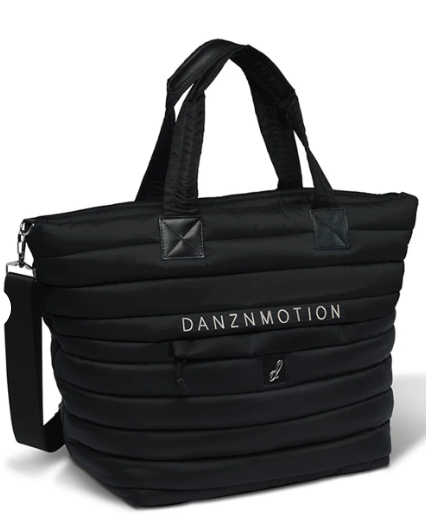 Style B23507 from Danshuz is the ultimate dancer’s oversized tote. Our new dance bag features a beautiful two-tone puffed exterior with an outside zipper pocket for quick access to your phone or personal items. The large inside compartment boasts 5 pockets to accommodate shoes, clothing and accessories to make organizing your gear a snap. This large inside space will hold all your dancing needs. The full-length zipper top is expandable to hold even more gear, which makes this a great travel bag as well. This tote also features double carrying handles, a removable, adjustable shoulder strap and the DANZNMOTION “d” logo icon. Wipes clean, is lightweight and folds flat.