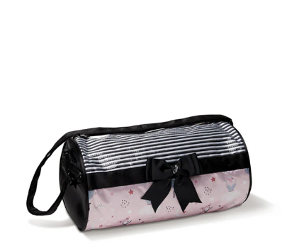 Style B22501  from Danshuz is a printed satin roll bag with black and white striping and a contrasting pink "Ballerina Dreams" print. Trimmed with black ribbon and bow with an embroidered "d" logo. Dance bag is also equipped with a zipper pocket at inside lining. Bag is fully lined, lightweight and folds flat.